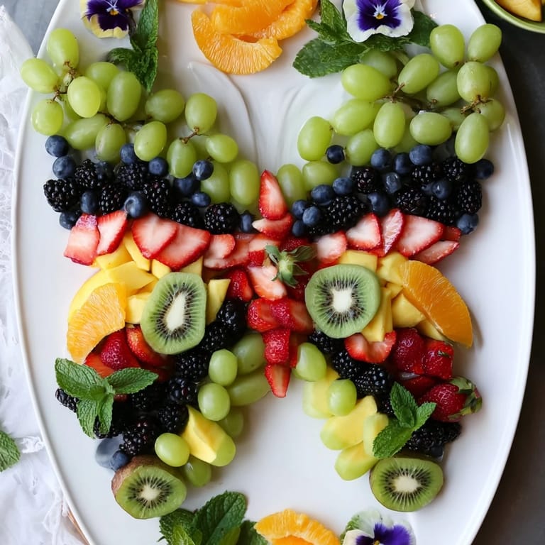 Save A vibrant and whimsical fruit platter arranged in the shape of a butterfly, perfect for parties, brunches, or special occasions. Fresh, colorful fruits are artfully displayed to create an eye-catching edible centerpiece.
