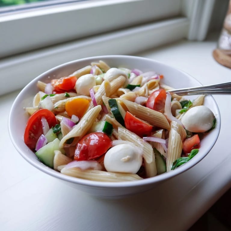 Save A vibrant, summery pasta salad featuring ripe tomatoes, creamy mozzarella, and fragrant fresh basil, tossed with a zesty balsamic dressing.