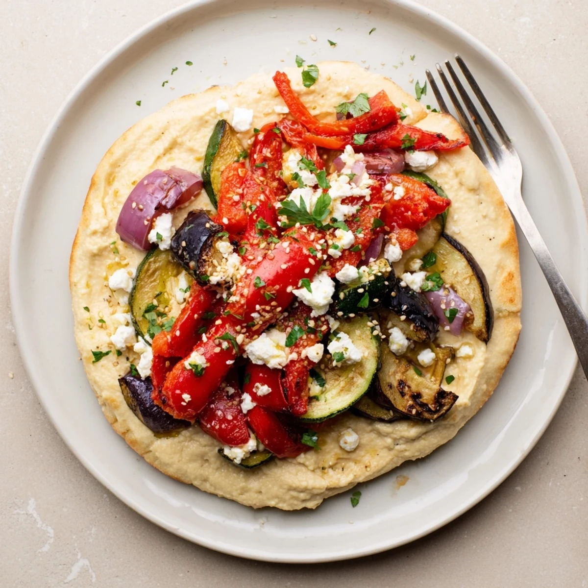 Save Soft, warm flatbreads generously topped with creamy hummus, roasted vegetables, and fresh herbs—a vibrant, satisfying vegetarian meal or snack.
