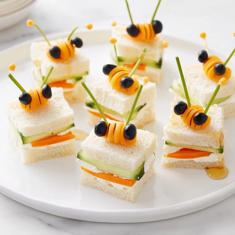 - Sandwiches: 12 slices soft sandwich bread (white or whole wheat), 6 tablespoons cream cheese or hummus, 2 tablespoons honey (optional for sweet version), 1 small cucumber thinly sliced, 1 small carrot thinly sliced, 12 black olives pitted (for bee stripes and eyes), 12 chive stems (for antennae)