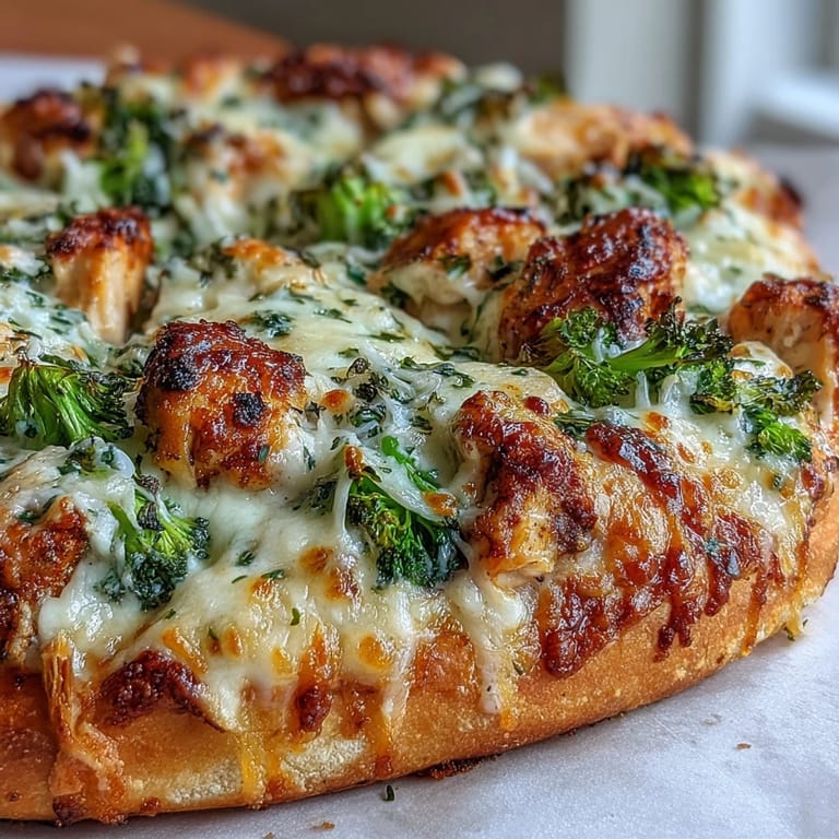 Save My neighbor knocked on my door one weeknight with a bag of fresh broccoli from her garden, and I realized I had chicken in the freezer and a ball of pizza dough waiting for attention. That simple combination sparked something—what if I turned pizza night into something that felt restaurant-quality but totally doable on a Tuesday? The creamy garlic sauce came together in minutes, and when that first slice came out of the oven with the cheese bubbling and golden, I understood why this became the dish I make whenever I want to feel like I've done something impressive without the fuss.