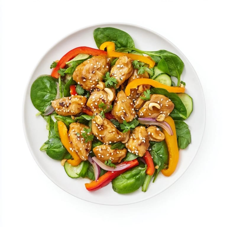 Save A vibrant, nutrient-packed salad bowl combining tender stir-fried chicken breast, fresh vegetables, and a zesty sesame-ginger dressing. Perfect for a wholesome lunch or dinner.