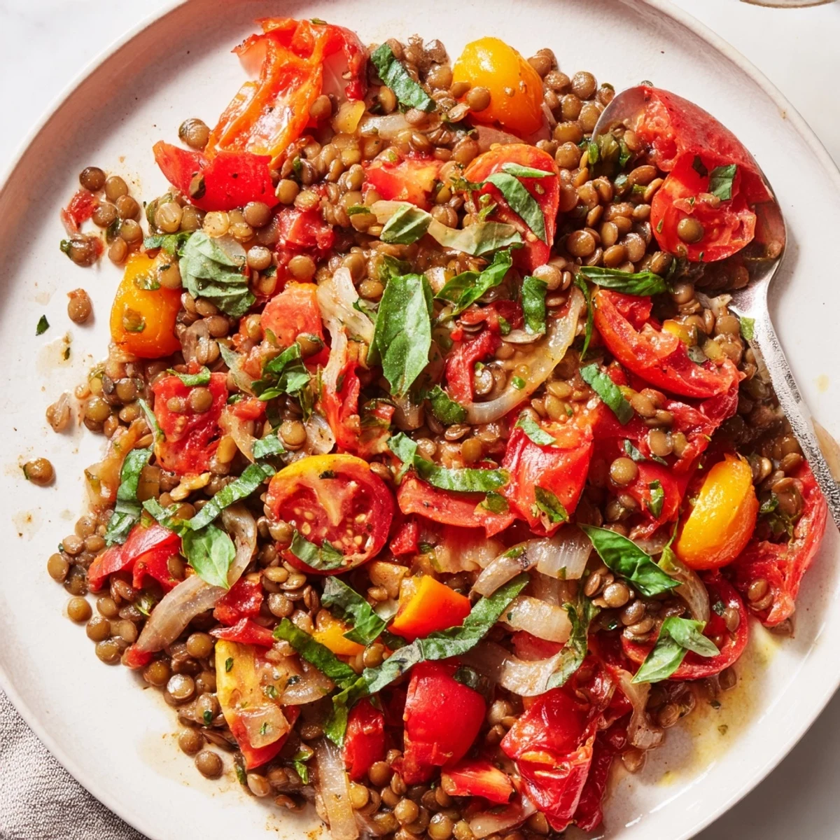 Save A hearty, one-pan vegetarian dish featuring tender lentils, juicy tomatoes, and a medley of fresh herbs for a vibrant, satisfying meal.