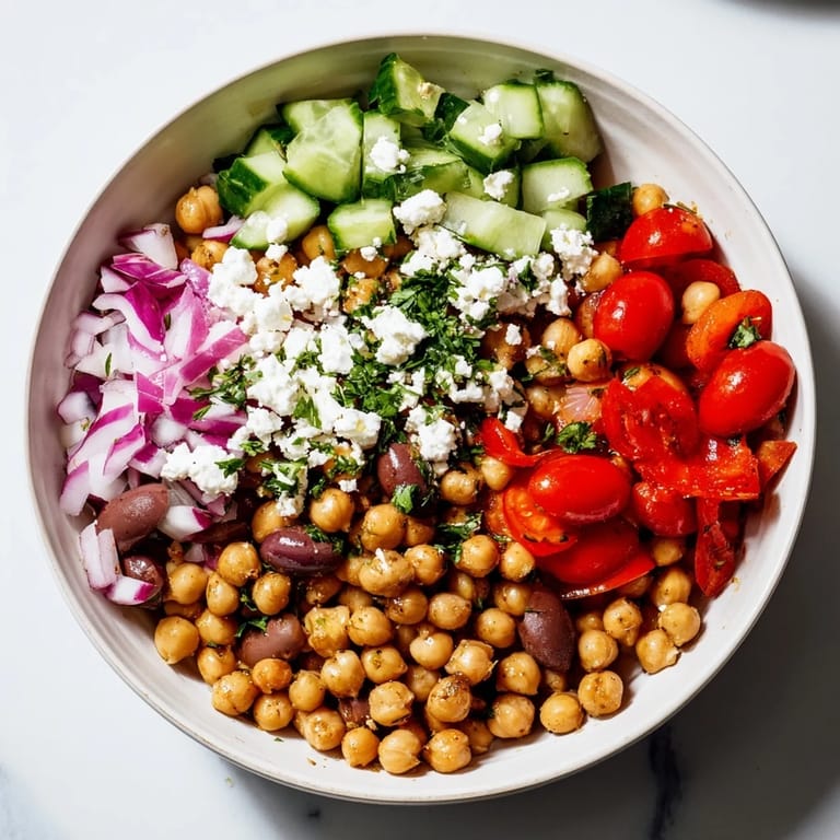 Save There's something about assembling a Mediterranean bowl that feels less like cooking and more like creating art on a plate. I discovered this particular combination on a lazy Sunday afternoon when I had a can of chickpeas, some vegetables that needed using, and absolutely no energy for anything complicated. The result was so bright and satisfying that I've been making variations of it ever since, each time tweaking it based on what's in my kitchen or what my mood demands that day.