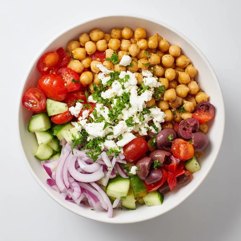 The genius of this bowl is that you can adapt it endlessly without breaking what makes it work. Swap the red pepper for yellow or orange if that's what you have. Use different olives if Kalamata aren't available—any briny olive will work. Add roasted chickpeas or pine nuts for crunch if you want that textural contrast. Even the dressing is flexible: more lemon if you like it bright, more oregano if you want herbiness to dominate. The only things that really matter are the chickpea base, the fresh vegetables, and the acidic dressing that ties everything together.