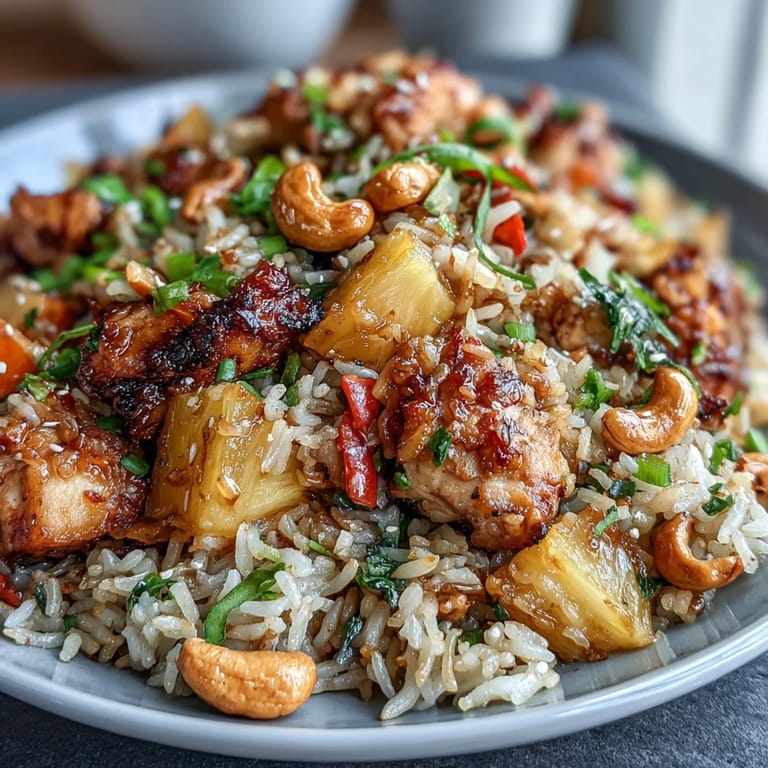 Save Imagine the sizzle of a hot wok, the aroma of garlic dancing through your kitchen, and the vibrant colors of pineapple and bell peppers coming together in perfect harmony. This Pineapple Chicken Fried Rice with Cashews transforms humble day-old rice into a restaurant-quality meal that's ready in just 30 minutes. The sweet burst of juicy pineapple mingles with savory soy sauce, tender chicken, and crunchy cashews to create a dish that's both comforting and exciting—a tropical escape on your dinner table.