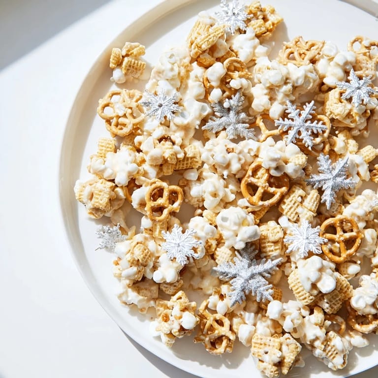 Save A crunchy, sweet-and-salty snack mix inspired by après-ski gatherings, featuring pretzels, popcorn, white chocolate, and wintry sprinkles.