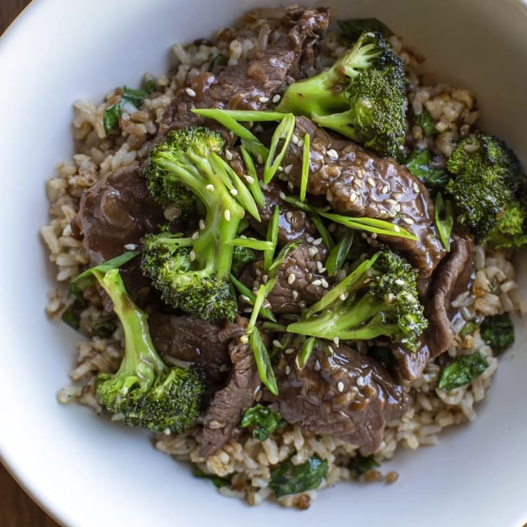 Save A comforting wholesome dish featuring tender beef & broccoli simmered in a savory sauce served over fluffy brown rice & fresh greens for a balanced meal.